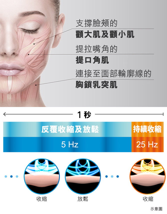 反覆收縮和放鬆肌肉的 5 Hz 與持續收縮的 25 Hz,提拉和緊緻肌肉。
