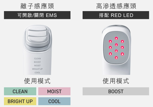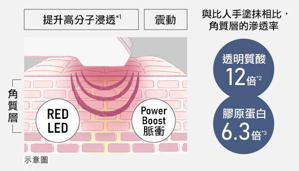 Power Boost 脈衝在約 3 秒內開闢讓美容成分滲透至角質層的通道,促進大分子美容成分滲透至角質層。RED LED 同時進行光療護理。使用「BOOST 模式」後,請立即進行 MOIST 或 BRIGHT UP 模式進行護理。