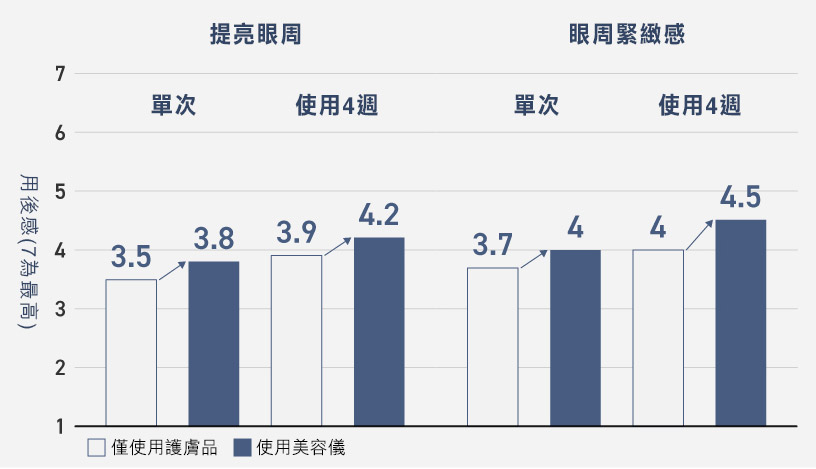 【測試方法】一次使用或連續使用4週,使用爽膚水和精華液以人手塗抹與使用美容儀塗抹,採用CLEAN / BOOST / MOIST / COOL 模式於眼周 (比較半邊臉頰) 。
