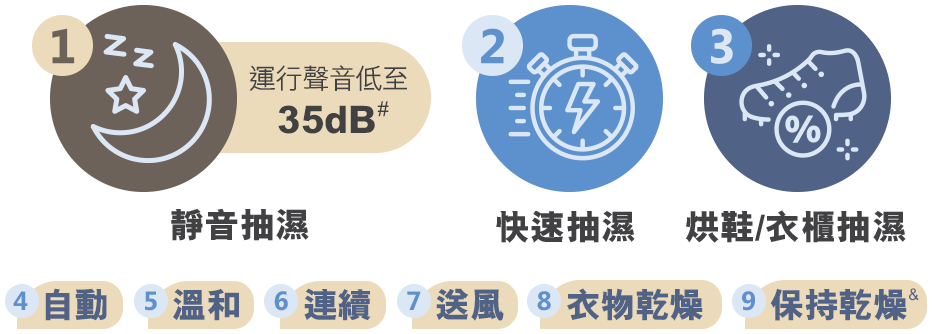 可因應理想濕度選擇不同的運轉模式,實現更高效、寧靜、慳電的抽濕效果。