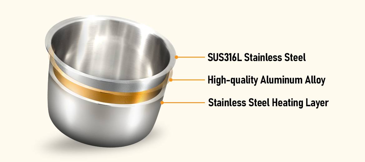 Made from SUS 316L, a high-quality food-grade stainless steel, The bottom of the inner pot has a shark-skin pattern design, which is high-strength and dense, reducing the surface area between rice grains and the inner pot, It is scratch-resistant and non-stick, ensuring durability and a lasting cooking experience.