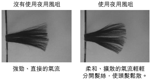 夜用風咀採用三種氣流:強風、分流風、柔風。吹乾頭髮時,它能均勻地分散髮絲,使頭髮順滑蓬鬆,不會造成蓬鬆感。