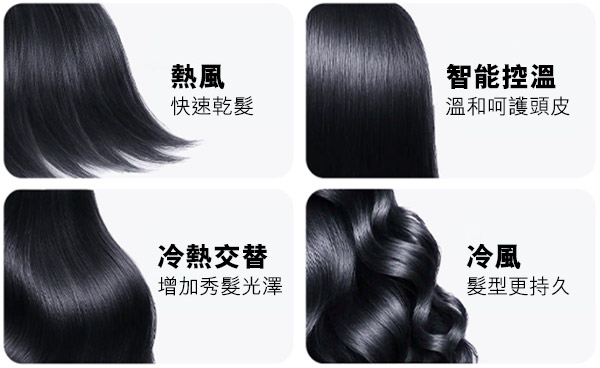 - 4種護理模式選擇(熱風、智能控溫、冷熱交替、冷風)