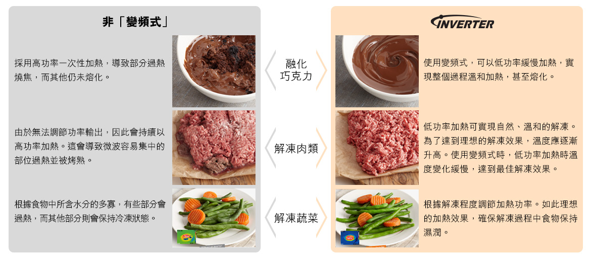 Panasonic「變頻式」技術能均勻烹調食物。由於能準確控制火力,令食物不會過度被烹調,同時保存食物營養。