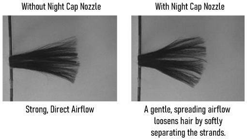 Night Cap Nozzle uses 3 types of airflow: strong, splitting, and gentle. It spreads hair strands evenly while drying, loosening them smoothly without creating puffiness.